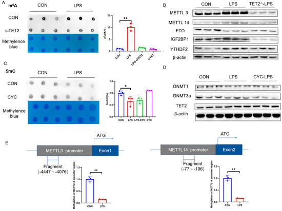 DNA samples were diluted to 250 ng/μL and heated at 95 °C for 10 min for denaturation. Samples were immediately placed on ice for 5 min, and 1 µL was loaded per dot on a Hybond-N+ membrane (GE Healthcare, Chicago, IL, USA). For m6A dot blotting, a 500 ng RNA sample was denatured at 95 °C for 5 min and transferred onto a Hybond-N+ membrane. The DNA and RNA dot blots were stained with 0.02% methylene blue (in 0.3 mol/L sodium acetate, pH = 5.2) as loading controls. After UV cross-linking, the membranes were washed with TBST buffer, blocked with 5% non-fat milk, and incubated with anti-5mC antibody (AB10805, Abcam, Hangzhou, China, diluted 1:1000) or anti-m6A antibody (AB151230, Abcam, Cambridge, MA, USA, diluted 1:1000) overnight at 4 °C. Then, the membrane was incubated with Goat Anti-Mouse IgG (BL001A, Biosharp, Hefei, China, diluted 1:200,000) at room temperature for 2 h. The signals were visualized by a chemiluminescence system (Bio-Rad, USA), and the dot density was analyzed with Quantity One software (Bio-Rad, USA).