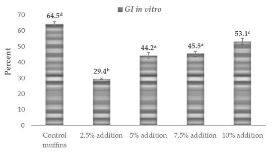 The results relating to the possible in vitro glycemic properties are presented in Table 3 along with Figure 1 and show a very promising influence of Trifolium repens L. on the probable antidiabetic characteristics of the supplemented muffins. The amount of total starch (TS) in the muffins was in the range of 42.04–43.85 (g·100 g−1 dm). The addition of white clover flowers at the level of 5–10% contributed to a higher value of this compound compared with the control muffins and those with 2.5% supplementation (p < 0.05). The amount of rapidly digestible starch (RDS) in the tested muffins was between 9.88 and 22.03 (g·100 g−1 dm). All white-clover-flower-enriched muffins were characterized by a significantly lower content of this fraction compared with the control samples (p < 0.05). The content of slowly digestible starch (SDS) was between 3.7 and 6.73 (g·100 g−1 dm), while the observed resistant starch (RS) was in the range of 16.54–28.57 (g·100 g−1 dm) (Table 3). The values of these indicators were statistically significantly higher in all the white clover flower muffins (p < 0.05). The calculated values of the starch digestibility index (SDI) referred as to glycemic index in vitro (GI in vitro) in the muffins were between 29.44% and 64.45% dm (Figure 1), while rapidly available glucose (RAG) (the sum of free glucose and the glucose released after 20 min of in vitro digestion) and free glucose (FG) were at the level of 19.86–34.67 (g·100 g−1 dm) and 4.43–5.09 (g·100 g−1 dm), respectively (Table 3). Again, all the muffins reinforced with the flowers of Trifolium repens L. were characterized by statistically significantly lower amounts of those parameters compared to the control muffins (p < 0.05).