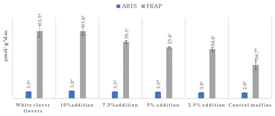 Antioxidant effects of muffins containing white clover flowers (Trifolium repens L.). The results are presented as mean ± sd. The values with different letters are significantly different at p < 0.05. Results are according to ABTS (2,2-azinobis) (3-ethyl-beznothaizoline-6-sulphonic acid) and FRAP (Ferric-Reducing Ability of Plasma) methods.