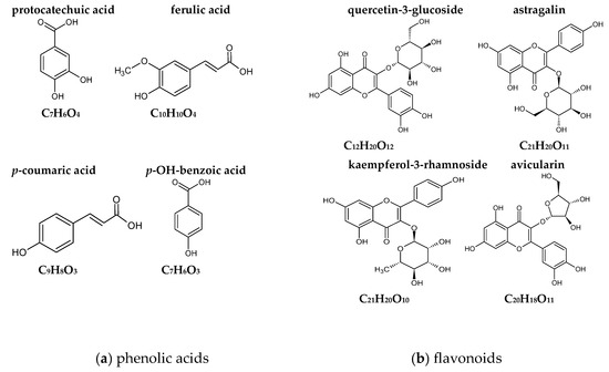 Twenty-five grams (25 g) of dry mass was extracted with 50 mL of methanol in an ultrasonic bath (POLSONIC Palczyński Sp. J., Warsaw, Poland) for 1 h at 30 °C. After evaporation, dry extracts were dissolved in 10 mL of methanol (HPLC gradient grade) and filtered through Millipore membrane filters with a pore size of 0.22 µm. RP-HPLC analyses were performed according to Sulkowska-Ziaja et al. [95] on a Merck-Hitachi liquid chromatograph (LaChrom Elite) with diode array detector (DAD) L-2455 and Purospher® RP-18e (250 × 4 mm/5 mm) column. Analyses were run at 25 °C using a mobile phase consisting of A—methanol, B—methanol and 0.5% acetic acid at a ratio of 1:4 (v/v). The gradient was as follows: 100% B for 0–20 min; 100–80% B for 20–35 min; 80–60% B for 35–55 min; 60–0% B for 55–70 min; 0% B for 70–75 min; 0–100% B for 75–80 min; 100% B for 80–90 min at a flow rate of 1 mL min−1. Detection was performed in the λ range of 200–400 nm, quantitative calculations were performed at λ = 254 nm. Identification was performed by comparison of peak retention times with authentic reference compounds and co-chromatography with standards. Identification was achieved by comparison of the retention times of the peaks with authentic reference compounds and co-chromatography with standards. Quantification was performed by measuring the peak area with reference to the standard curve derived from five concentrations (0.03125 to 0.5 mg mL−1). The standards were as follows: caffeic acid, chlorogenic acid, cinnamic acid, ellagic acid, gallic acid, gentizic acid, isoferulic acid, neochlorogenic acid, o-coumaric acid, protocatechuic acid, rosmarinic acid, salicylic acid, sinapic acid, syringic acid, apigenin, apigetrin (apigenin 7-glucoside), hyperoside (quercetin 3-O-galactoside), formononetin, isoquercetin (quercetin 3-O-glucoside), isorhamnetin, kaempferol, luteolin, myricetin, populnin (kaempferol 7-O-glucoside), robinin (kaempferol 3-O-robinoside-7-O-rhamnoside), quercetin, quercitrin (quercetin 3-O-rhamnoside), rhamnetin, rutoside and vitexin from Sigma Aldrich (St Louis, MO, USA); p-coumaric acid, vanillic acid, ferulic acid and p-hydroxybenzoic acid from Fluka (Bucha, Switzerland); caftaric acid, cryptochlorogenic acid, isochlorogenic acid, catechin, epigallocatechin, epicatechin gallate, epicatechin, epigallocatechin gallate and cinaroside (luteolin 7-O-glucoside) from ChromaDex (Irvine, CA, USA); 4-O-feruloylquinic acid, apigetrin (apigenin 7-O-glucoside), apigenin 7-O-glucuronide, astragalin (kaempferol 3-O-glucoside), avicularin (quercetin 3-O-α-L-arabinofuranoside) and trifolin (kaempferol 3-O-galactoside) from ChemFaces (Wuhan, China).