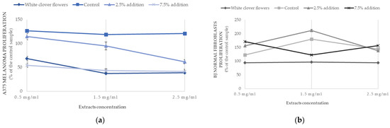 Antiproliferative effects of muffins containing white clover flowers (Trifolium repens L.) on (a) melanoma A375 and (b) human normal fibroblasts BJ cell lines depending on the extracts’ concentration (0.5 mg/mL; 1.5 mg/mL; 2.5 mg/mL). The results are presented as mean ± sd.