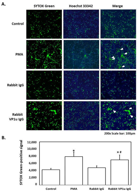 Rabbit anti-B19 VP1u IgG induces NETs release. The dHL-60 cells treated with PMA, rabbit IgG, and rabbit anti-B19V-VP1u IgG (rabbit VP1u IgG), respectively, were stained with (A) SYTOX Green (left panel) and Hoechst 33342 (middle panel). The merged images were shown in the right panel, and arrows indicated the NETs. (B) The quantified results of SYTOX Green-positive signal. Three independent experiments were performed. The symbols * and # indicate significance (p < 0.05) as compared to the control and rabbit IgG, respectively. p-value is calculated by one-way ANOVA followed by Tukey’s multiple comparison test.