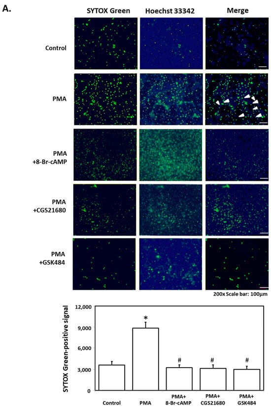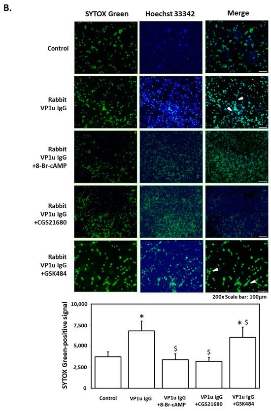 Inhibitory effect of NETs inhibitors (8-Br-cAMP, CGS21680, GSK484) on PMA and rabbit anti-B19V-VP1u IgG induced NETs. (A) The PMA and (B) rabbit anti-B19V-VP1u IgG (rabbit VP1u IgG) treated-dHL-60 cells in the presence of 8-Br-cAMP, CGS21680 or GSK484 were stained with SYTOX Green (left panel) and Hoechst 33342 (middle panel). The merged images were shown in the right panel, and arrows indicated the NETs. The quantified results of SYTOX Green-positive signals were shown in the lower panel. Three independent experiments were performed. The symbols *, #, and $ indicate significance (p < 0.05) as compared to the control, PMA, and rabbit anti-B19V-VP1u IgG, respectively. p-value is calculated by one-way ANOVA followed by Tukey’s multiple comparison test.