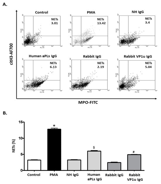 Rabbit B19V-VP1u IgG increases citH3 and MPO expressions. (A) The representative results of the dHL-60 cells were treated with PMA, normal human IgG (NH IgG), human aPLs IgG, rabbit IgG, and rabbit anti-B19V-VP1u IgG (rabbit VP1u IgG), and the presence of NETs was measured by detecting the expressions of citH3 and MPO with flow cytometry (B) The quantified results of NETs. Three independent experiments were performed. The symbols *, $, and # indicate significance (p < 0.05) as compared to the control, human IgG, and rabbit anti-B19V-VP1u IgG, respectively. p-value is calculated by one-way ANOVA followed by Tukey’s multiple comparison test.