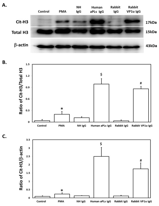 Rabbit anti-B19V-VP1u IgG increases citrullinated histone H3 (Cit-H3) expression. (A) Western blot analysis was used to detect the presence of Cit-H3 in dHL-60 cells treated with PMA, normal human IgG (NH IgG), human aPLs IgG, rabbit IgG, and rabbit anti-B19V-VP1u IgG (rabbit VP1u IgG). (B) The ratio of Cit-H3 amount relative to total H3. (C) The ratio of Cit-H3 amount relative to β-actin. Three independent experiments were performed. The symbols *, $, and # indicate significance (p < 0.05) compared to the Control, NH IgG, and rabbit VP1u IgG, respectively. p-value is calculated by one-way ANOVA followed by Tukey’s multiple comparison test.
