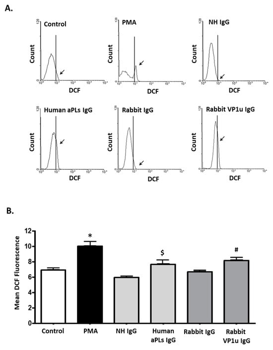 A total of 2 × 106 cells were treated with either 25 ng/mL PMA or 100 μg/mL NH IgG/human aPLs IgG/rabbit IgG/rabbit VP1u IgG for 7 h. Subsequently, the cells were further incubated for 30 min at 37 °C in the presence of 5 μM DCFH-DA (Dichloro-dihydro-fluorescein diacetate) and then subjected to flow cytometry analysis.