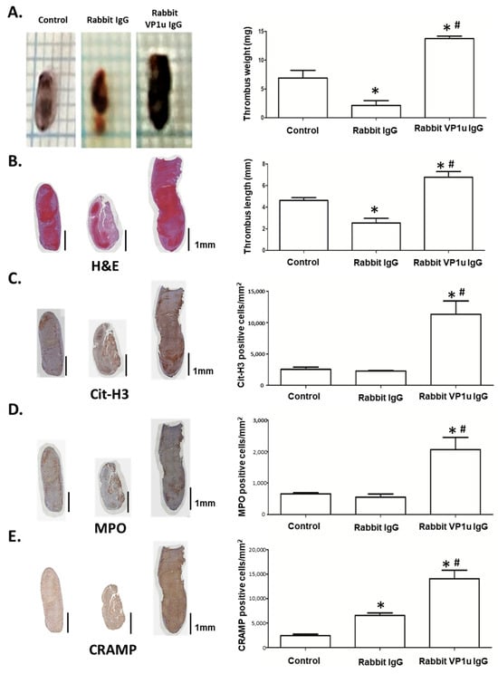 Rabbit anti-B19V-VP1u IgG promotes venous thrombosis in C57BL/6 mice with inferior vena cava ligation. (A) The representative images of thrombus from the mice treated with PBS, rabbit IgG, and rabbit anti-B19V-VP1u IgG (rabbit VP1u IgG). Sections of the thrombus stained with (B) H&E, (C) anti-citrullinated histone H3 (Cit-H3), (D) MPO, and (E) CRAMP. Scale bar = 1 mm. The right panel showed the quantified results of thrombus weight, thrombus length, and positive cells of Cit-H3, MPO, and CRAMP signal. The symbol * and # indicate significance (p < 0.05) as compared to the control and rabbit IgG, respectively. p-value is calculated by one-way ANOVA followed by Tukey’s multiple comparison test.