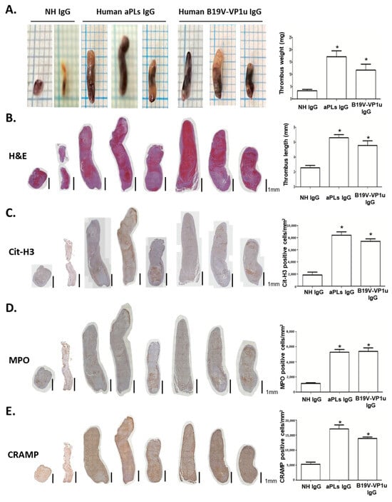 A venous stenosis-induced thrombosis mouse model was adopted to verify the influence of B19V-VP1u IgG-mediated NETs on thrombosis in vivo. Compared with the mice receiving PBS or rabbit IgG, the mice receiving rabbit anti-B19V-VP1u IgG formed significantly larger thrombi in both weight and length (Figure 6A,B). Given that Cit-H3, MPO, and CRAMP are recognized as the most well-known biochemical markers of NETs, immunohistochemistry staining (IHC) for Cit-H3, MPO, and CRAMP was performed. A significantly higher amount of Cit-H3-, MPO- and CRAMP-positive infiltrated neutrophils were detected in the thrombi sections from the mice receiving rabbit anti-B19V-VP1u IgG as compared to those mice receiving PBS or rabbit IgG (Figure 6C–E). Additionally, a significantly larger weight and length thrombi were detected in the mice receiving human aPLs IgG and human anti-B19V-VP1u IgG compared to those receiving normal human IgG (Figure 7A,B). Accordingly, a significantly higher amount of Cit-H3-, MPO- and CRAMP-positive infiltrated neutrophils were detected in the thrombi sections from the mice receiving human aPLs IgG or human anti-B19V-VP1u IgG as compared with those receiving normal human IgG (Figure 7C–E).