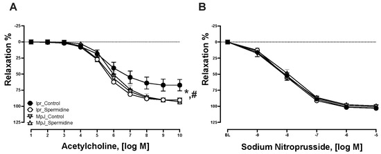 Spermidine prevents endothelial dysfunction in lupus mice. Relaxation responses to increasing concentrations of ACh (A) and SNP (B) in thoracic aortas from MRL/lpr and MRL/MpJ mice with and without spermidine treatment. Values are mean ± SEM, n = 11–15 per group. BL, baseline after 70% maximal contraction with phenylephrine. * significant difference between lpr_Control and MpJ_Control, p < 0.05. # significant difference between lpr_Control and lpr_Spermidine, p < 0.05.