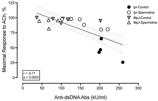 Maximal vasorelaxation responses to ACh were negatively correlated with anti-dsDNA antibodies (r: −0.71, p = 0.0003) (Figure 3). The correlation between maximal vasorelaxation to ACh and anti-dsDNA antibodies was the strongest among all phenotypes (Table 2). This result suggests that the endothelial dysfunction of SLE is associated with disease activities, represented by anti-dsDNA antibodies. Other SLE phenotypes such as spleen weight, length, and kidney weight were all negatively correlated with maximal vasorelaxation response to ACh (r from −0.39 to −0.43 with p-value from 0.0049 to 0.0123). Body weight, heart weight, and heart weight-to-body weight were not significantly correlated with ACh-induced vasorelaxation, suggesting that endothelial dysfunction in SLE is related to lupus phenotypes.