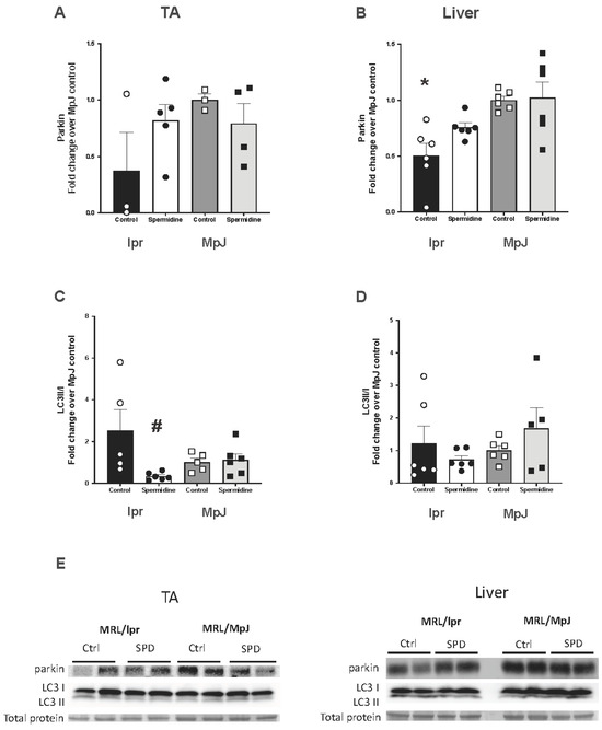 The protein content of LC3 II/I was measured as a marker of mitophagy. The LC3II/I ratio was not statistically different between lpr_Control and MpJ_Control in either the aorta or liver samples. However, both the aorta (Figure 4C,E) and liver (Figure 4D,E) from lpr_Control showed a higher LC3II/I ratio compared to those of MpJ_Control. LC3II/LC3I was significantly lower in lpr_Spermidine (0.33 ± 0.07 a.u.) compared to the lpr_Control group (2.53 ± 0.99 a.u.), which would suggest that spermidine may have increased the mitophagic influx, thus reducing the amount of LC3II/I remaining.