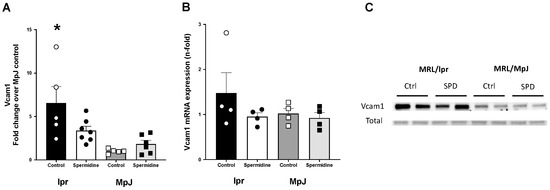 Vascular inflammatory markers are elevated in lupus mice. Densitometry analysis of the Western Blot (A) and mRNA expression (B) for Vcam1 in thoracic and abdominal aortas from MRL/lpr and MRL/MpJ mice with and without spermidine treatment. (C) Western Blot images of Vcam1 and total protein by Ponceau stain. Values are mean ± SEM. n = 4–7 mice per group. * significantly different from MpJ_Control, p < 0.05.