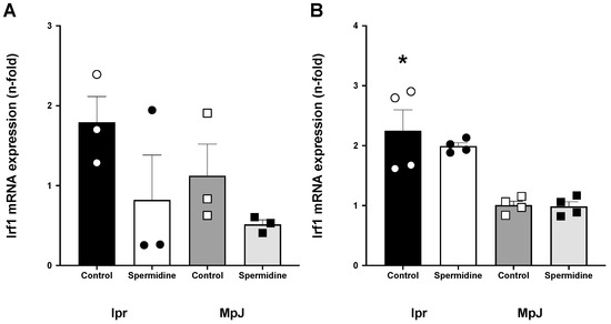 Interferon regulatory factor 1 (Irf-1) gene expression in lupus mice. mRNA expression of interferon regulatory factor 1 (Irf1) shown in the spleen (A) and liver (B) from MRL/lpr and MRL/MpJ mice with and without spermidine treatment. Values are mean ± SEM. n = 3–4 mice per group. * significantly different from MpJ_Control, p < 0.05.