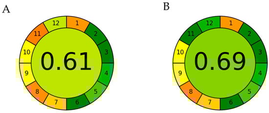 Representative pictogram for the green index of the extraction of anthocyanin from Callistemon citrinus using two different methods. (A) The index for the extraction with accelerated solvent extraction using methanol solution; (B) The index for the extraction with MAE using the new ethanol (EtOH) solution. In both pictograms, the colour scale (red-yellow-green) indicates the performance at each stage of the procedure. The less chemically ‘green’ the process, the more red it appears.