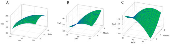Response surface plots analysis for the total anthocyanin content yield (TAC) from Callistemon citrinus powder with microwave assisted extraction (MAE) with the same solid-liquid ratio, 1:10 (w/v). (A) microwave power and EtOH % in the reaction mix; (B) microwave power and minutes; (C) EtOH % in the reaction mix and minutes.