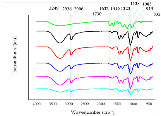 In Figure 4 the characteristic FTIR spectrum of PVA, characterized by bands with a maximum at around 3249 cm−1 (due to O—H stretching), 2936 cm−1 (due to asymmetric stretching of CH2), 2906 cm−1 (due to symmetric stretching of CH2), 1632 cm−1 (due to water absorption), 1416 cm−1 (due to CH2 bending), 1323 cm−1 (due to δ (OH), rocking with CH wagging), 1138 cm−1 (due to shoulder stretching of C–O, representative of a sequence with a crystalline structure), 1083 cm−1 (due to stretching of C=O and bending of -OH, representative of a sequence with an amorphous structure), 915 cm−1 (CH2 rocking), 832 cm−1 (C–C stretching) is depicted. As can be seen from the graph, the modification of the starting materials with increasing concentrations of anthocyanins from 0.1 to 1.0% does not induce the appearance of a new band, indicating a dispersion of utilized materials to functionalize the new bioplastic, and the appearance of a new band at the maximum utilized concentration at about 1730 cm−1 is due to the increasing concentration of anthocyanins. There are also some changes in the bands at 1138 cm−1 and 1083 cm−1, influencing the sequence with crystalline and amorphous structures that are directly related to the increasing percentage of anthocyanins added, in accordance with the obtained mechanical data.