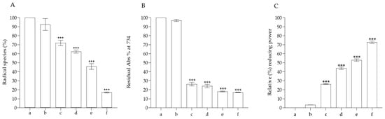 Evaluation of antioxidant activity of PVA-based bioplastics with different % of anthocyanins (0.10, 0.25, 0.50, 1%) in the most common antioxidant assays. (A) ABTS assay; (B) DPPH assay; (C) ferric reducing power (FRAP) assay. The letters in the different graph indicate: a, control sample; b, PVA alone; c, PVA plus 0.10% of anthocyanins; d, PVA plus 0.25% of anthocyanins; e, PVA plus 0.50% of anthocyanins; f, PVA plus 1.00% of anthocyanins. *** p < 0.001.
