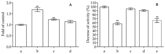 Analysis of the changes in apple samples packed or not packed after different intervals of time (0 and 72 h). (A) Changes in the browning of the samples monitored at 420 nm. The letters in the graph indicate: a, apple samples not packed after 0 h; b, apple samples not packed after 72 h; c, apple sample packed with PVA film alone after 72 h; d, apple samples packed with PVA plus 1.00% of anthocyanins after 72 h. (B) Changes in the antioxidant potential monitored by DPPH assay. The letters in the graph indicate: a, control without samples; b, apple samples not packed after 0 h; c, apple samples not packed after 72 h; d, apple sample packed with PVA film alone after 72 h; e, apple samples packed with PVA plus 1.00% of anthocyanins after 72 h. The ** indicates significant changes with respect to the control at p > 0.05.