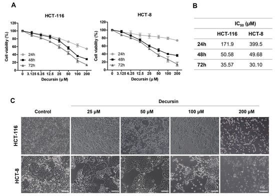 Decursin decreases cell viability in colorectal cancer cells. (A) Cell viability of HCT-116 and HCT-8 colorectal cancer (CRC) cells after treatment with decursin for 24, 48, and 72 h was detected using an MTT assay. (B) The half-maximal inhibitory concentration of decursin in CRC cells. (C) Morphology of HCT-116 and HCT-8 CRC cells after treatment with the indicated decursin concentrations for 48 h. Data are represented as the mean ± standard deviation (SD) of three independent experiments.