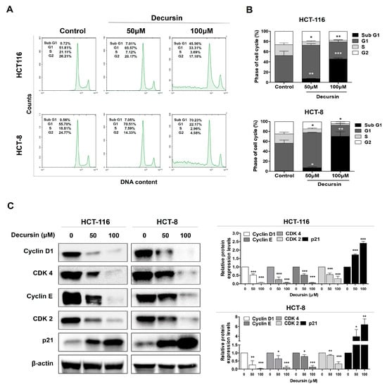 Decursin causes cell cycle arrest in CRC cells. (A,B) HCT-116 and HCT-8 CRC cells treated with decursin were stained with Annexin-V fluorescein isothiocyanate/propidium iodide (FITC/PI) and analyzed using flow cytometry. (C) Cyclin D1, CDK4, cyclin E, CDK2, and P21 protein expression levels in Western blotting. β-actin was used as an internal control. Data are represented as the mean ± SD of three independent experiments. * p < 0.05, ** p < 0.01, and *** p < 0.001 compared to the control group.