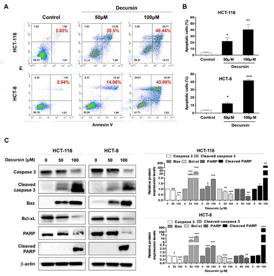 Decursin induces apoptosis in CRC cells. (A) Decursin-induced apoptosis was measured using an Annexin-V FITC/PI apoptosis detection kit and flow cytometry. (B) The percentage of apoptotic cells in the treatment group was calculated. (C) HCT-116 and HCT-8 CRC cells were treated with 0, 50, and 100 μM decursin for 48 h. Cell lysates were subjected to Western blotting to assess the expression of cell apoptosis-related proteins, including PARP, cleaved PARP, caspase-3, cleaved caspase-3, Bax, and Bcl-xL. β-actin was used as an internal control. Data are represented as the mean ± SD of three independent experiments. * p < 0.05, ** p < 0.01, and *** p < 0.001 compared to the control group.