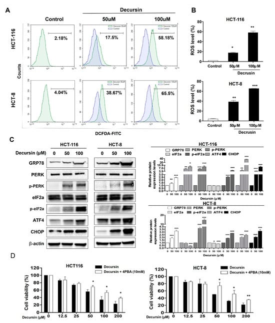 Treating HCT-116 and HCT-8 CRC cells with decursin caused a significant increase in reactive oxygen species (ROS) production in a dose-dependent manner (Figure 4A,B). The expression levels of the components of the endoplasmic reticulum (ER) stress pathway, such as G protein-coupled receptor 78 (GRP78), PKR-like ER kinase (p-PERK), p-α subunit of eukaryotic initiation factor 2 (p-eIF2a), transcription factor 4 (ATF4), and C/EBP-homologous protein (CHOP), were significantly increased in a dose-dependent manner. These results indicate that decursin can significantly activate ER stress. When cells were pretreated with 4-phenylbutyric acid (4-PBA) and decursin, the cell survival rate increased compared to that of cells treated with decursin alone (Figure 4D). These results suggest that ER stress may be a major factor in the decursin-induced apoptosis of CRC cells.