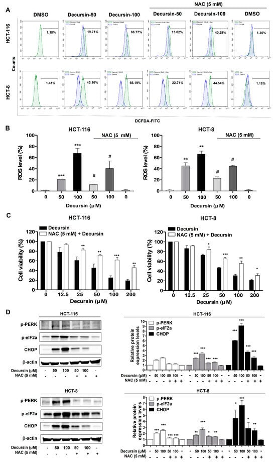 Decursin induces ER stress via ROS production in CRC cells. (A) Flow cytometry was performed to determine the intracellular ROS levels in HCT-116 and HCT-8 CRC cells with or without 5 mM N-acetyl-L-cysteine (NAC) treatment for 1 h before decursin administration for 48 h. (B) The bar graph shows that 5 mM NAC treatment reduces decursin-induced ROS accumulation. (C) An MTT assay was performed to determine the cell viability of HCT-116 and HCT-8 CRC cells with or without 5 mM NAC treatment for 1 h before decursin treatment for 48 h (n = 3 for each group). (D) HCT-116 and HCT-8 CRC cells were pretreated with 5 mM NAC for 1 h, then incubated with decursin for 48 h. Western blotting was used to determine p-PERK, p-elF2a, and CHOP expression. β-actin was used as an internal control. Data are represented as the mean ± SD of three independent experiments. * p < 0.05, ** p < 0.01, and *** p < 0.001 compared to the control group; # p < 0.05 decursin vs. decursin + NAC.