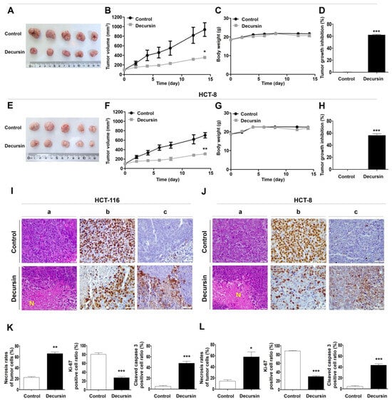 Decursin inhibits the growth of mouse xenograft CRC cells in vivo. The HCT-116 and HCT-8 cell xenograft mouse models were treated with phosphate-buffered saline and were intraperitoneally injected with decursin (10 mg/kg) twice weekly for 15 days. Representative images of (A) HCT-116 and (E) HCT-8 implanted tumors in each group at study termination. (B,F) Tumor volumes were measured on the indicated treatment days. (C,G) Mice body weight. (D,H) Tumor growth inhibition rate. (I–L) Immunohistochemistry (IHC) analysis. Representative images of IHC and (Ia,Ja) hematoxylin and eosin staining (Ib,Jb) for Ki-67 and (Ic,Jc) cleaved caspase 3 expression in tumor tissues. (K–L) For the staining analysis of necrotic rate/Ki-67/cleaved caspase 3 in tumor tissue, the percentage of positive cells (×400) among > 100 cancer cells was calculated in three randomly selected fields of view using a high-power lens (five mice per group, * p < 0.05, ** p < 0.01, and *** p < 0.001 compared to the control group).
