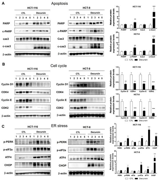 Decursin induces apoptosis, cell cycle arrest, and ER stress in mouse xenograft CRC in vivo. The patterns of changes in proteins related to apoptosis, the cell cycle, and ER stress in tumor tissues in vivo were analyzed using Western blotting. Tumor tissue lysates were immunoblotted using antibodies against (A) apoptosis-related proteins—PARP, cleaved PARP, caspase-3, and cleaved caspase-3; (B) cell cycle-related proteins—cyclin D, CDK4, cyclin E, and CDK2; and (C) ER stress-related proteins—p-PERK, p-eIF2α, ATF4, and CHOP. β-actin was used as a loading control (five mice per group; * p < 0.05, ** p < 0.01, and *** p < 0.001 compared to the control group).