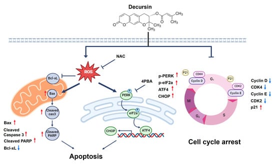 Increased ROS levels and the perturbation of the intracellular redox status increase the levels of unfolded proteins in the ER and induce an ER stress response [47]. Under oxidative stress conditions, ER stress plays a vital role in inducing apoptosis in various tumors, including breast cancer, prostate cancer, and melanoma [48,49,50]. CHOP is a crucial regulator of ER stress-induced cell death [51]. In this study, decursin induced ER stress by upregulating GPR78, PERK, and CHOP expression in CRC cells. The initiation of the ER stress-induced apoptotic pathway increases CHOP gene expression, triggering an ER stress-specific cascade for the implementation of apoptosis. Consequently, in this study, the upregulation of CHOP expression was observed in CRC cells after decursin treatment. Additionally, 4-PBA reversed cell growth after decursin treatment. Moreover, the decursin-induced activation of ER stress was inhibited by NAC, indicating that ROS act as upstream signaling molecules involved in decursin-induced ER stress in CRC cells. This finding suggests that decursin induces apoptosis by activating ROS-mediated ER stress in CRC cells (Figure 8).