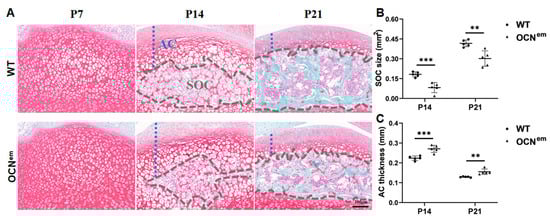 The POC was generated in the diaphysis of long bones, which were delayed in the OCNem embryonic period (Figure 1). Later, the endochondral ossification continues within the epiphyses, generating the SOC in the postnatal period. As expected, SOC development retardation in OCNem mice was found in Figure 2A and Figure S1. From postnatal proximal tibia, the articular cartilage (AC) was unstratified, with rounded chondrocytes exhibiting a random isotropic distribution pattern at P7; from P14-P21, the SOC formed and extended. The SOC was well-developed in WT mice, but much smaller (p = 0.0008, p = 0.0039) in OCNem mice (Figure 2B). Meanwhile, OCNem mice showed thicker (p = 0.0010, p = 0.0031) AC than WT mice (Figure 2C). Those anomalies indicated that the deficiency of OCN disturbed endochondral ossification both in embryonic and postnatal period.