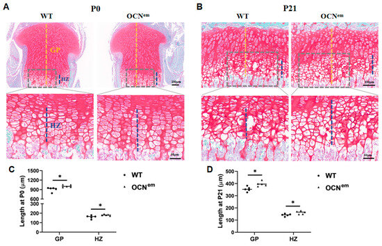 Knockout of OCN significantly increased the cartilage length. (A,B) Representative safranin O/fast green staining of tibial growth plate (GP) (upper panel) and higher magnification view of hypertrophic zone (HZ) (lower panel) of WT and OCNem mice at P0 (A) and P21 (B). At upper panel, black dashed lines indicated growth plates (Scale bars: 100 μm); at lower panel, gray dashed lines outlined HZ (Scale bars: 50 μm). (C,D) Quantification of the overall length of GP, PZ and HZ at P0 (C) and P21 (D). GP: growth plate, PZ: proliferative zone, HZ: hypertrophic zone. There were 5 mice in each group, no samples were excluded and all data were expressed as mean ± SD. The statistical significance was denoted as * p < 0.05 by Student’s t-test.