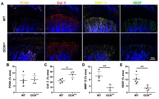 Knockout of OCN increased chondrocyte differentiation and postponed vascularization process. (A) IF staining to detect proliferation, differentiation and vascular invasion markers in mice growth plate. Scale bars: 200 μm; (B–E) Quantification of the expression of PCNA, Col II, MMP 13, and VEGF in the growth plate. There were 5 mice in each group, no samples were excluded and all data were expressed as mean ± SD. The statistical significance was denoted as * p < 0.05, ** p < 0.01 by Student’s t-test.
