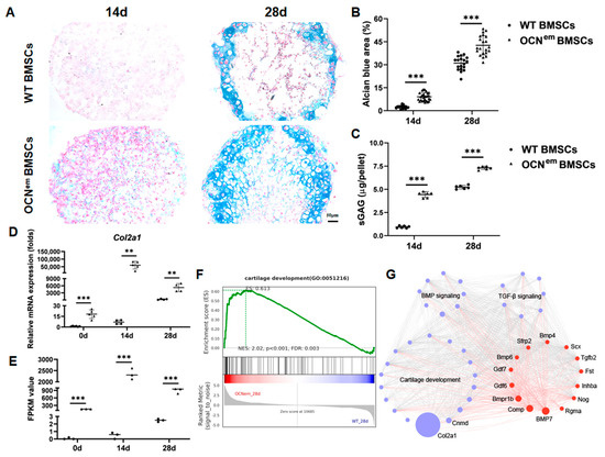 Chondrogenic differentiation of BMSCs from OCNem mice was significantly enhanced. (A) Photomicrographs of WT BMSCs and OCNem BMSCs pellets on days 14 and 28 stained with alcian blue/nuclear fast red staining. Scale bars: 50 μm; (B) Quantified the percentage of alcian blue positive area; (C) sGAG content in WT BMSCs and OCNem BMSC pellets on day 14 and 28; (D,E) Detection of chondrogenic differentiation–related genes Col2a1 expression by RT–qPCR and RNA–sequencing; (F) GSEA analyzed the genes associated with cartilage development; (G) Transcriptional network of the differentially expressed genes related to cartilage development, BMP signaling and TGF–β signaling. The node size was set based on foldchange in the differentially expressed genes. Red-colored circles indicate genes present in 2 or more purple–colored circles. There were more than 3 samples in each group, no samples were excluded and all data were expressed as mean ± SD. The statistical significance was denoted as ** p < 0.01, *** p < 0.001 by Student’s t-test.