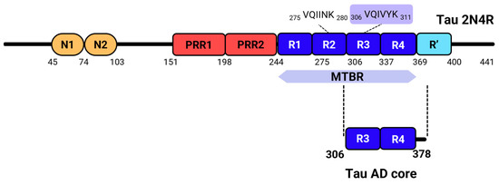 Tau structure. Full-length 2N4R tau contains two N-terminal domains (in orange), followed by two proline-rich regions (in red), and four microtubule-binding repeats (R1, R2, R3, and R4), which comprise nearly the entire microtubule-binding domain of tau. Within these repeats, the PHF6*/PHF6 hexapeptides, highlighted above the R2 and R3 repeats, play a crucial role in tau aggregation [18,19]. A final pseudo-repeat, R’, also contributes to tau’s interaction with microtubules and is located in the C-terminal region [20]. The Tau AD core, which forms the structured core of tau fibrils in Alzheimer’s Disease [15], primarily involves the R3 and R4 repeats and includes the PHF6 peptide.
