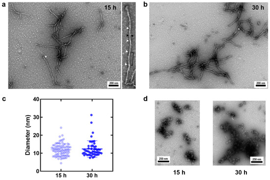 In order to obtain a biophysical and morphological characterization of TADC aggregates formed in the absence of aggregation-inducing cofactors, 100 μM TADC was incubated under quiescent conditions at 37 °C for up to 30 h. To evaluate the progression of the formed TADC aggregates along the reaction, we employed negatively stained TEM to visualize the morphology of the species formed after incubation during 15 h and 30 h, which roughly correspond to the mid-growth phase and to the plateau stage [14]. The analysis of the obtained images shows the formation of short fibrillar species irrespective of the incubation time analyzed (Figure 2a–c), in agreement with the fact that during amyloid fibril formation, fibrils are present at all times [21]. At the two examined time points, we could not detect a noticeable difference in the apparent diameter of these fibrillar structures (Figure 2c; 11.9 ± 3.4 nm at 15 h and 12.4 ± 4.6 nm at 30 h).
