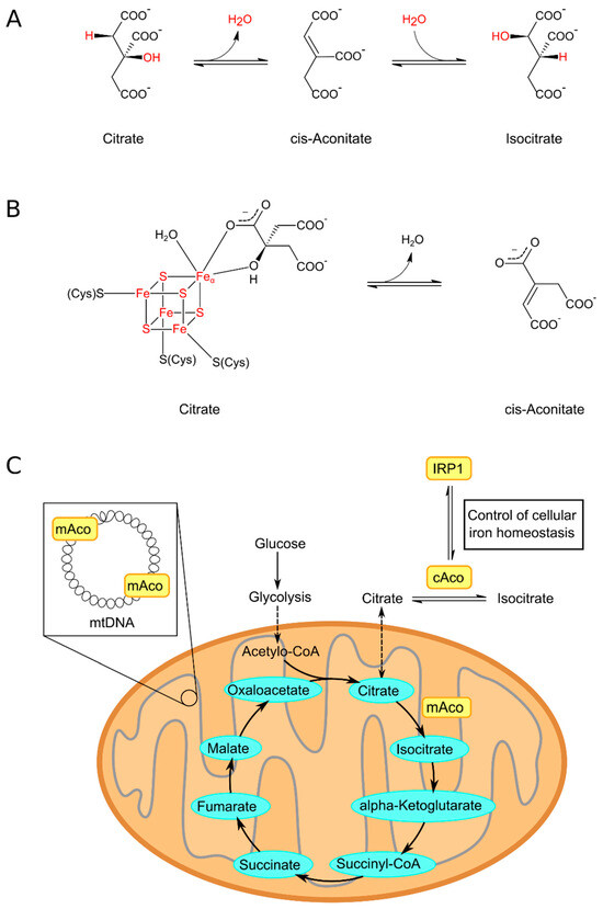 Aconitase engagement in the TCA cycle. (A) Aconitase isomerization citrate to isocitrate; (B) The mechanism of aconitase reaction. The transformation of citrate to cis-aconitate is promoted by the ISC. The supplement of labile Feα converts an inactive aconitase into its active form and coordinates with oxygen atoms of citrate and water molecules to promote the reaction catalysis; (C) Aconitase cellular localization. cAco—cytosolic aconitase (Aco1); mAco—mitochondrial aconitase (Aco2). The redox state of the Aco1 ISC defines the function of the enzyme. IRP-1 is an oxidized (apo-) form of cAco, which takes part in maintaining iron homeostasis in the cell, whereas the reduced (holo-) form—similar to Aco2—accomplishes the isomerization of citrate into isocitrate. Additionally, Aco2 is a protein with a role in the stabilization of mtDNA.