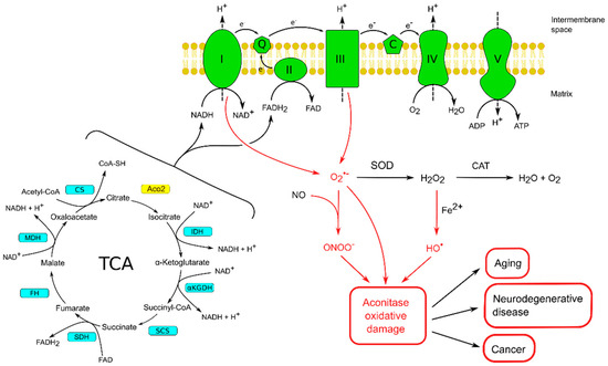 Mitochondrial ROS/RNS generation is believed to act as the main cause of aconitase oxidative damage. One of the main functions of the TCA cycle is the generation of electrons used by the mitochondrial ETC to produce ATP. The multi-subunit complexes of ETC are located in the inner mitochondrial membrane. The electrons provided by NADH and FADH2 from the TCA cycle are transmitted to NADH ubiquinone reductase (complex I) or succinate dehydrogenase (complex II), and then to ubiquinol-cytochrome c reductase (complex III), and finally to oxygen through cytochrome c oxidase (complex IV). The functioning of mitochondria is indissolubly connected with ROS production; firstly, superoxide anion (•O2−). Superoxide is converted to hydrogen peroxide (H2O2) by the enzyme superoxide dismutase (SOD) in mitochondria. H2O2 is then converted to water by catalase (CAT). Superoxide can damage iron–sulfur proteins such as aconitase, subsequently releasing ferrous iron. The presence of ferrous iron promotes the formation of a hydroxyl radical (HO•) from hydrogen peroxide. Superoxide is also capable of reacting with nitric oxide (NO.) to form peroxynitrite (ONOO−). •O2−, HO•, and ONOO− can cause extensive oxidative damage to aconitase. Abbreviations: CS, citrate synthase; Aco2, aconitase 2; IDH, isocitrate dehydrogenase; αKGDH, α-ketoglutarate dehydrogenase; SCS, succinyl-CoA synthetase; SDH, succinate dehydrogenase; FH, fumarate hydratase; MDH, malate dehydrogenase.