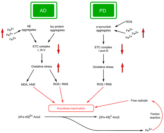Schematic figure illustrating some of Aco2 affecting pathways in AD and PD. Alzheimer’s disease (AD): Aggregation of Aβ plaques and tau tangles intensifies with increasing iron concentration. Aβ and tau protein aggregates interact with ETC complexes I, III–V and disrupt their function leading to overproduction of free radicals (where complex I exhibits maximum activity). •O2− and ONOO− can directly modulate the activity of aconitase. The products of lipid peroxidation (MDA and HNE) also modify enzyme activity at the post-translational level. Parkinson’s disease (PD): Activation of α-synuclein by ROS leads to cytoplasmic protein aggregation. Fe2+ accumulation stimulates increased α-synuclein synthesis and aggregation. These aggregates cause inhibition of ETC complexes I and III. Dysfunction of ETC enzyme complexes in dopaminergic neurons of the SN contributes to the inactivation of Aco2 by intensifying the production of ROS in the patient’s brain. In both AD and PD, an active form of the enzyme (ISC [4Fe-4S]2+) can be oxidized by different forms of free radicals, forming the inactive Aco2 form (ISC [3Fe-4S]+) and releasing Fe2+. Fe2+ promotes the generation of hydroxyl radicals in the Fenton reaction, with the subsequent Aco2 oxidation. Abbreviations: Aβ, amyloid-beta; HNE, 4-hydroxy-2-nonenal; MDA, malondialdehyde; ROS, reactive oxygen species; RNS: reactive nitrogen species.