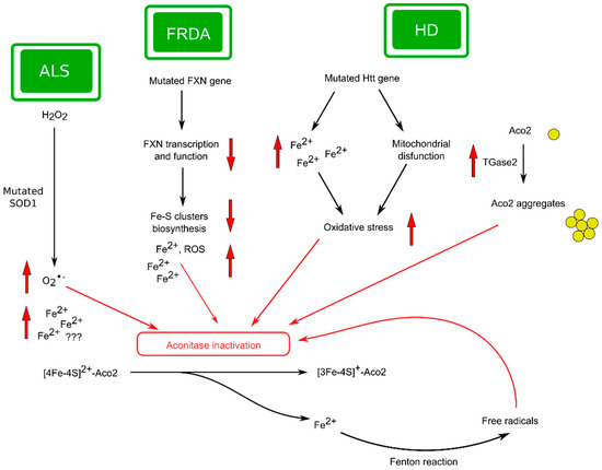 Mitochondrial aconitase is an important enzyme that connects the TCA cycle and other metabolic systems, is engaged in the regulation of the intracellular iron pool, and being a source of free radical oxygen species, is itself very sensitive to oxidative stress. The scientific literature indicates that aconitase dysfunction is a significant factor in the progress of neurodegenerative processes [27,35,38]. However, its specific role in different kinds of neurodegenerative pathological conditions development remains largely underappreciated.