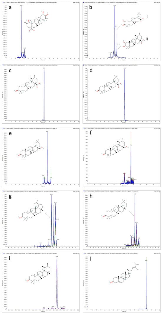 - Rhourri-Frih, B.; Chaimbault, P.; Claude, B.; Lamy, C.; André, P.; Lafosse, M. Analysis of Pentacyclic Triterpenes by LC-MS. A Comparative Study between APCI and APPI. J. Mass Spectrom. 2009, 44, 71–80. [Google Scholar] [CrossRef]