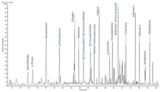 - Adams, R.P. Identification of Essential Oil Components by Gas Chromatography/Mass Spectrometry, 4th ed.; Allured Publishing Corporation: Carol Stream, IL, USA, 2007. [Google Scholar] [CrossRef]