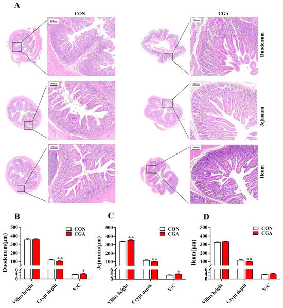The villus height and crypt depth of the duodenum, jejunum, and ileum are shown in Figure 1. In the duodenum (Figure 1B), the crypt depth of the piglets in the CGA group was significantly lower than that in the CON group (p < 0.05), and the V/C in the CGA group was significantly higher than that in the CON group (p < 0.05). In the jejunum (Figure 1C), the villus height and V/C of the piglets in the CGA group were significantly higher than those in the CON group, and the crypt depth in the CGA group was significantly lower than that in the CON group. In the ileum (Figure 1D), the crypt depth of the piglets in the CGA group was significantly lower than that in the CON group (p < 0.05).