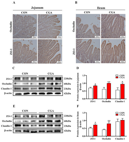 Tight junctions serve as crucial indicators for evaluating the intestinal integrity of piglets. The expression of tight junctions in the jejunum and ileum are shown in Figure 2. As shown in Figure 2A,B, the results of the immunohistochemistry analyses indicated that the protein abundance of Occludin and zonula occludens (ZO)-1 in the jejunum and ileum of the piglets in the CGA group was higher than that in the CON group (p < 0.05). Consistently, the results of the Western blot analysis showed that the relative protein abundance of Claudin-1, Occludin, and ZO-1 in the jejunum of the piglets in the CGA group was significantly higher than that in the CON group (p < 0.05). Moreover, the relative protein abundance of Occludin and ZO-1 in the ileum of the piglets in the CGA group was significantly higher than that in the CON group (p < 0.05).