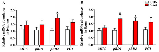 The mRNA expression of porcine beta defensins (pBDs) and mucins are shown in Figure 3. In the jejunum (Figure 3A), the pBD2 mRNA expression in the CGA group was significantly higher than that in the CON group (p < 0.05). In the ileum (Figure 3B), the mRNA expression of pBD1 and pBD2 in the CGA group was significantly higher than that in the CON group (p < 0.05). There was no significant difference in the mRNA expression of MUC between the two groups in the jejunum and ileum (p > 0.10).
