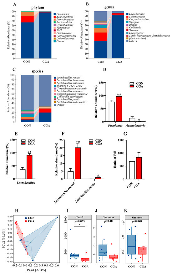 A total of 3,122,363 effective sequences were successfully generated from 12 ileal content samples (two groups, n = 6), with an average of 63,722 sequences per sample, and 14,336 OTUs were obtained for further analysis. The sequencing data are accessible online at the National Genomics Data Center (Beijing, China) with the accession number CRA017663. Three major bacterial phyla in the ileal contents of the piglets were Firmicutes (76.38% or 97.60%), Actinobacteria (14.03% or 0.98%), and Proteobacteria (8.30% or 0.19%), accounting for over 98% of the total bacterial community. As shown in Figure 4, the relative abundance of Firmicutes in the CGA group was significantly higher than that in the CON group (p < 0.05), while the relative abundance of Actinobacteria in the CGA group was significantly lower than that in the CON group (p < 0.05). Within the changes in Firmicutes (Figure 4B,E), the relative abundance of Lactobacillus in the CGA group was significantly higher than that in the CON group (p < 0.05). At the genus level (Figure 4C,F), the major sources of changes in Lactobacillus were Lactobacillus reuteri and Lactobacillus pontis. The relative abundance of Lactobacillus reuteri and Lactobacillus pontis in the CGA group was significantly higher than that in the CON group (p < 0.05). For beta diversity (Figure 4H), the PCoA (Bray–Curtis and Jaccard distance) analysis result showed that the microbiota in the CGA group tended to clearly separate from the CON group. For the alpha diversity (Figure 4I–K), the ileal microbiota were indicated by the Chao1, Simpson, and Shannon indexes. The Chao1 index in the CGA group was significantly lower than that in the CON group (p < 0.05), while there were no significant differences in the Simpson and Shannon indexes.