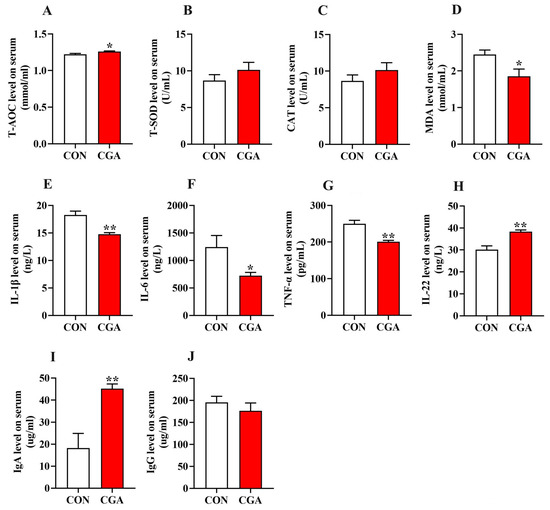 Effects of dietary supplementation with CGA on antioxidant status and immune-inflammatory level in the serum of piglets. (A–D) The antioxidative and oxidative indicators in the serum. (E–H); the concentration of inflammatory factors in the serum; (I,J) the immunoglobulin concentration in the serum. Values are presented as the mean ± SEM (n = 6). *, 0.01 < p ≤ 0.05. **, p ≤ 0.01.