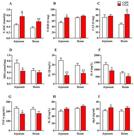 In the jejunum, the concentrations of T-AOC, T-SOD, and sIgA in the CGA group were significantly higher than those in the CON group (p < 0.05), while the concentrations of IL-1β, IL-6, TNF-α, and MDA in the CGA group were significantly lower than those in the CON group (p < 0.05).