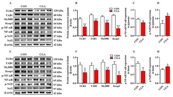 The relative protein abundance of the NF-κB and Nrf2 signaling pathways in the jejunum and ileum are shown in Figure 7. In the jejunum, the relative protein abundance of TLR4, TAB1, MyD88, and Keap1 in the CGA group was significantly lower than that in the CON group (p < 0.01). Meanwhile, the phosphorylation of NF-κB in the CGA group was significantly lower than that in the CON group (p < 0.05), while the Nrf2 phosphorylation in the CGA group was significantly higher than that in the CON group (p < 0.05). In the ileum, the relative protein abundance of TLR4, MyD88, and Keap1 in the CGA group was significantly lower than that in the CON group (p < 0.05). Moreover, the Nrf2 phosphorylation in the CGA group was significantly higher than that in the CON group (p < 0.05).