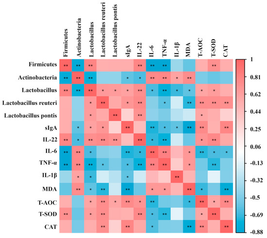 The results of the Spearman correlation between the gut microbiota, oxidative stress indicators, and immune-inflammatory factors in the ileum of the piglets are shown in Figure 8. For the immune-inflammatory factors, the IL-22 secretion was significantly positively correlated with the abundance of Firmicutes (p < 0.01), and significantly negatively correlated with the abundance of Actinobacteria (p < 0.05). Regarding the Firmicutes, the IL-22 secretion was significantly positively correlated with the abundance of Lactobacillus at the genus level (p < 0.01), and Lactobacillus reuteri and Lactobacillus pontis at the species level (p < 0.01). The secretion of IL-6 and TNF-α was significantly negatively correlated with the abundance of Firmicutes (p < 0.01), while the secretion of IL-1β, IL-6, and TNF-α was significantly positively correlated with the abundance of Actinobacteria (p < 0.05). Regarding the Firmicutes, the secretion of IL-1β, IL-6, and TNF-α was significantly negatively correlated with the abundance of Lactobacillus at the genus level (p < 0.05). Moreover, the sIgA secretion was significantly positively correlated with the abundance of Lactobacillus at the genus level (p < 0.05) and Lactobacillus reuteri at the species level (p < 0.01), and was significantly negatively correlated with the abundance of Actinobacteria (p < 0.05). For the oxidative stress indicators, the T-SOD concentration was significantly positively correlated with the abundance of Firmicutes. Regarding the Firmicutes, the concentration of T-AOC and T-SOD was significantly positively correlated with the abundance of Lactobacillus at the genus level (p < 0.01) and Lactobacillus reuteri at the species level (p < 0.01). The MDA concentration was significantly positively correlated with the abundance of Actinobacteria (p < 0.01), and was negatively correlated with the abundance of Lactobacillus at the genus level (p < 0.05) and Lactobacillus reuteri at the species level (p < 0.01).